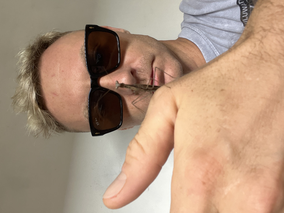 A man wearing sunglasses is holding a praying mantis on his nose. The mantis is a slender, brown color. The man has light-colored hair. He is wearing a grey shirt. His hand is visible in the foreground. The background appears to be a plain, white surface.