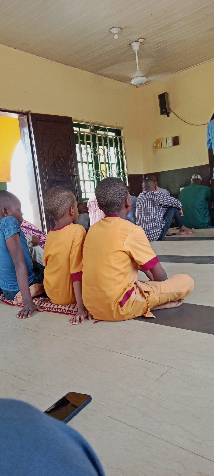 This image depicts an indoor scene within the city of Lokoja, Nigeria, populated by several individuals. The perspective is low, taken from behind a person wearing blue trousers, with a black mobile phone visible on the light-colored tiled floor directly in front of their legs. In the foreground, three young males are seated on a patterned mat. The leftmost child wears a blue t-shirt and dark bottoms, facing left. The two central children wear matching orange tunics with dark red trim on the sleeves and pockets, and matching orange trousers. They are seated with their backs to the camera, facing forward towards the deeper part of the room. Further back, on a slightly elevated platform or step, several adults are visible. One adult in a plaid shirt and dark trousers sits with his back to the camera, facing forward. To his right, another adult, partially obscured, wears a green garment and a white cap, also facing forward. Other individuals are partially visible or obscured in the background. The room features light beige walls with a darker brown trim along the lower portion. A window with green metal bars is visible on the left side, allowing natural light into the space. A dark wooden door with carved details is open beside the window. The ceiling is white, paneled, and features a single white ceiling fan and a bare light bulb. A dark speaker is mounted on the upper right wall. Below the speaker, a cluster of various electrical switches or outlets are affixed to the wall. The overall environment appears functional and well-lit.