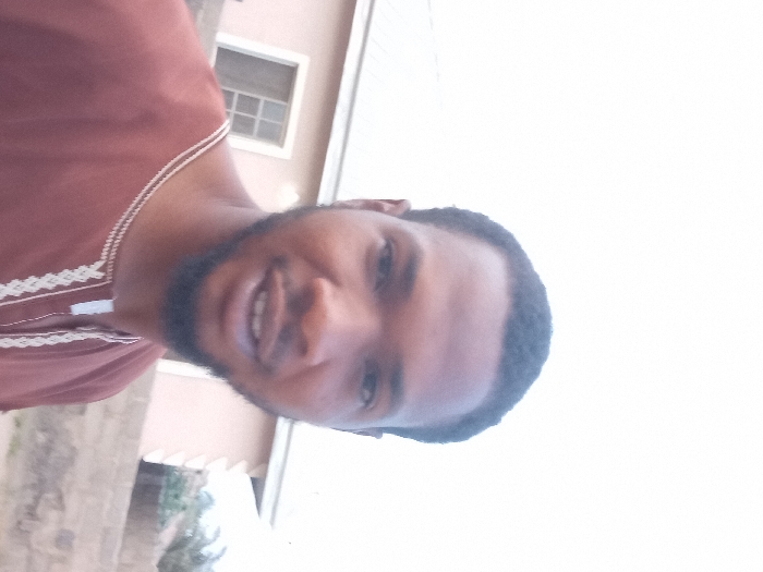 A man with a beard and short dark hair smiles at the camera. He wears a brown shirt with white trim around the neck and chest. A building is visible in the background, showing a window and part of the structure. The image appears to be taken outdoors in bright daylight. The man's face is well-lit.