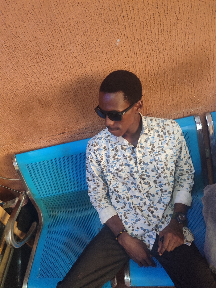 A dark-skinned man with short hair sits on a blue metal bench, wearing sunglasses and a patterned white shirt