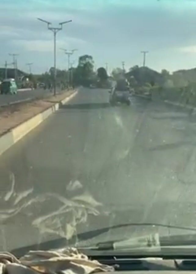 view from inside a vehicle traveling on a paved road lined with streetlights. In the distance, several people appear to be constructing a makeshift barrier or roadblock in the middle of the road. The road is flanked by curbs and unpaved shoulders, with buildings and trees visible in the background under a sky with patchy clouds.