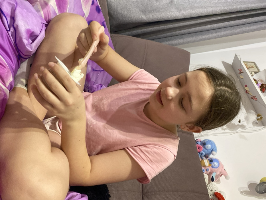A young girl sits on a couch with purple and lavender floral bedding. She wears a light pink t-shirt and her hair is pulled back. She holds a small white container in one hand and a plastic spoon filled with a white substance in the other, seemingly about to eat. A shelf with decorative items is visible on the wall to her right, and stuffed animals are nestled against the back of the couch behind her. The overall scene is casual and domestic.