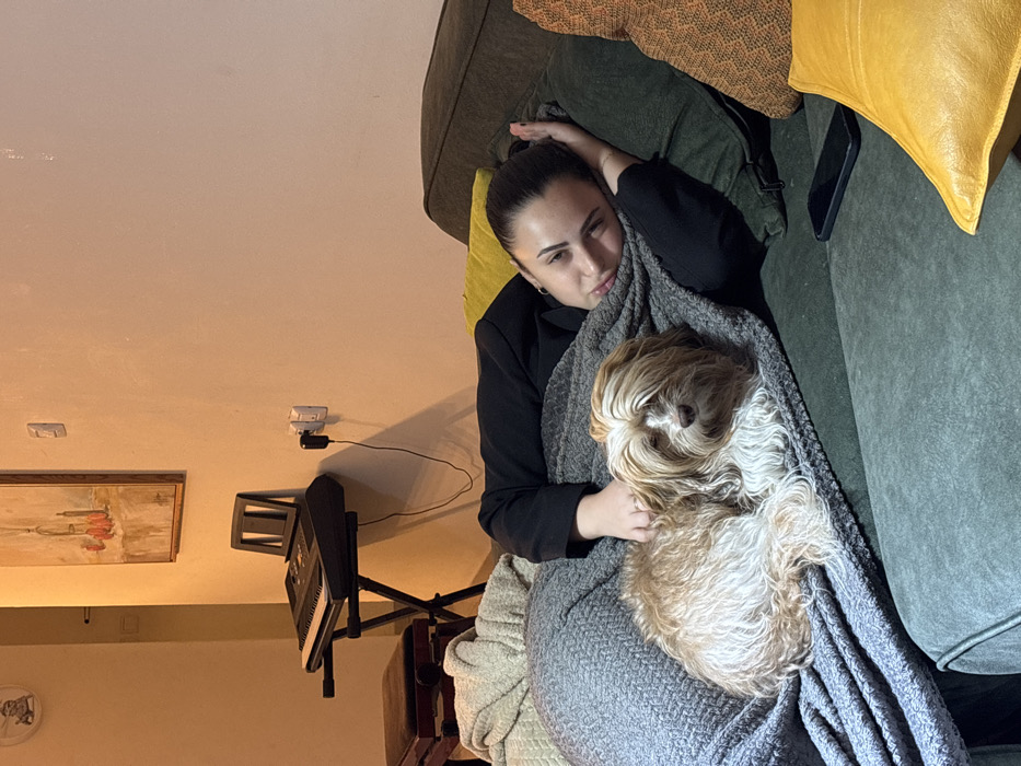 - "A woman lies on a green couch, wrapped in a gray blanket with a fluffy tan and white dog" by FM-mfRp53, licensed under CC BY 4.0