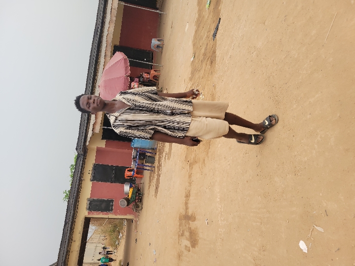 A young male is depicted walking on an unpaved dirt path in Egbagu, Nigeria, with buildings and commercial activity in the background. The subject, positioned slightly right of center, is an individual with dark skin and short hair, wearing a vertical black and white striped short-sleeved shirt, beige shorts, and dark slide sandals. He holds a dark smartphone in his left hand and looks directly at the camera. The ground is a light brown, unpaved surface. In the background, a single-story building with reddish-brown walls and a dark roofline extends across the frame. To the left, an open archway reveals a path leading to the distance where several figures are walking. Adjacent to the building on the left, a yellow wheelbarrow, orange plastic chairs, and tables with bowls are present. To the right, a large maroon market umbrella provides shade over an area that includes more plastic chairs and various objects. The sky is uniformly overcast.