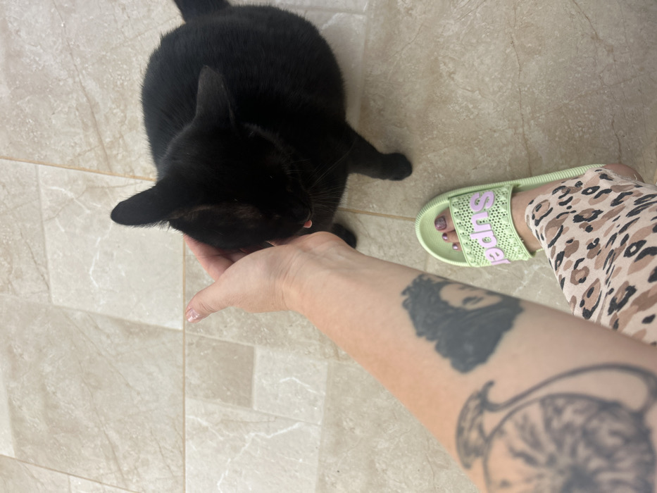 This image depicts an indoor scene on a light-colored tiled floor, identified as being in the city of Karmiel, Israel. The primary subjects are a black domestic cat and the lower right arm and leg of a human. The floor consists of large, rectangular, light beige or off-white tiles with subtle gray veining. The cat, a solid black short-haired feline, is positioned on the tiles, facing generally towards the right side of the frame with its head slightly turned left. Its mouth is slightly open, and a small pink tongue is visible. The human's lower right arm extends from the mid-left of the frame towards the cat's head. The hand is gently placed on the cat's head, appearing to stroke or pet it. The human's fingernails are painted a light, neutral color. The forearm displays multiple tattoos; one prominent tattoo depicts a grayscale profile of a person's head with curly hair, and another larger, partially visible design is present further down the arm. Below the human's arm, the lower right leg and foot are visible. The leg is partially covered by light-colored pants with a dark brown leopard print. The foot wears a light green slider sandal featuring a textured upper strap with the word "SUPER" embossed in light pink capital letters. The toenails are painted a dark red or purple color. The interaction shows the human hand making physical contact with the cat's head, suggesting a moment of affection or comfort.