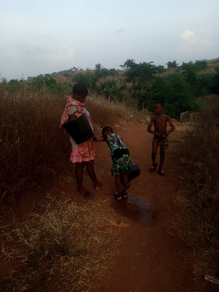 The scene depicts three individuals, an adult female and two children, outdoors on a reddish-brown dirt path in Ukwu-Abwa, Nigeria, under an overcast or twilight sky. The adult female, positioned on the left, wears a light top, a pink ruffled skirt, and a patterned fabric draped over her shoulders; she holds a black bucket by its handle in her left hand and looks down. A younger child, in the center, wears a green and black patterned dress and is bent over, facing away, attending to a black bucket resting in a dark puddle on the ground. A second child, male, stands on the right, shirtless in patterned shorts, observing the others. The path is flanked by dry, tall brown grasses, and a verdant hillside with scattered trees and a distant structure is visible in the background.