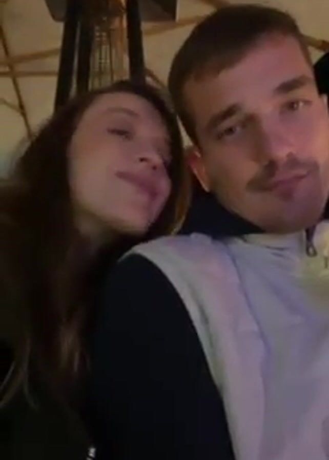 A video shows a couple outdoors, likely on a patio. A woman with long brown hair leans against a man with short brown hair and a mustache. She kisses him on the cheek. A patio heater is visible in the background. The couple appears relaxed and affectionate.