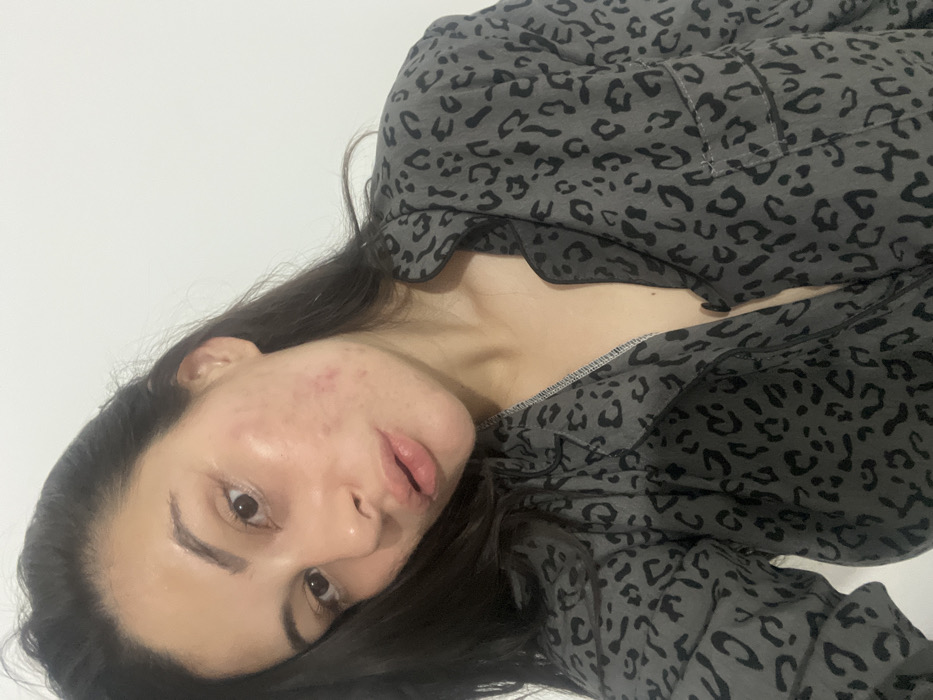 The image depicts a single individual, identified as an adult female with dark hair, posing for a photograph indoors against a plain, light-colored wall. The setting is presumed to be in Kiryat Bialik, Israel, though no specific identifying features of the city are discernible from the visual information. The individual is shown from the chest up, looking directly at the camera. Her face exhibits redness and multiple blemishes, particularly on the cheeks and jawline. She is wearing a gray long-sleeved collared shirt with a black leopard print pattern, which is partially unbuttoned at the chest. The lighting is even and consistent with an indoor environment. No other subjects or objects are present within the frame.