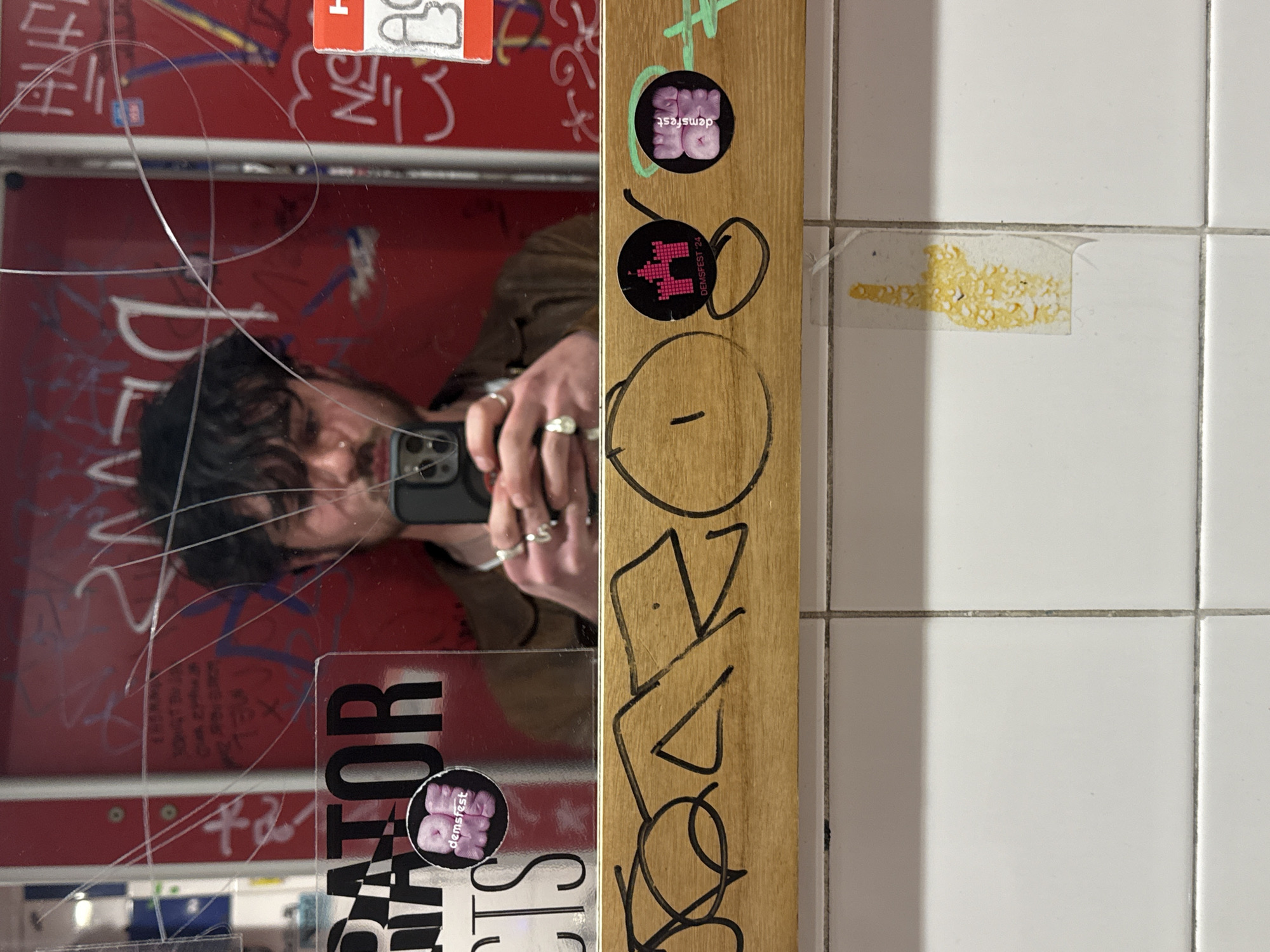 A selfie is being taken in front of a mirror covered in graffiti and stickers. The person in the reflection has dark hair and is wearing a brown jacket. The mirror is attached to a wooden frame with more graffiti and stickers. To the right of the frame, there is a tiled wall with a residue of tape on it. The location is Unknown, Unknown.
