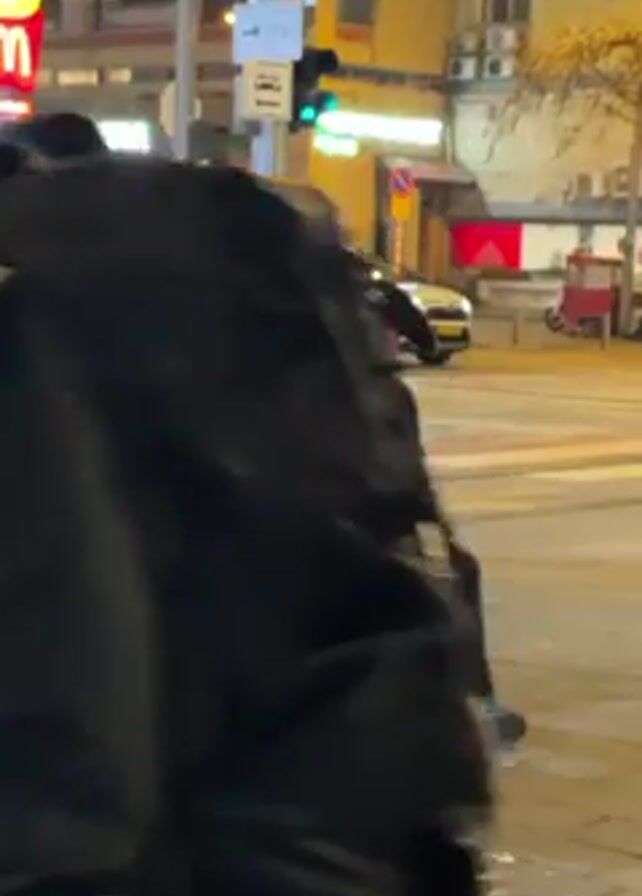 night-time street scene. A man wearing a black jacket with white trim and a backpack walks past a bench. Two men are sitting on the bench. One is wearing a black hoodie and jeans and is holding a small object in his hand. The other man is dressed as a pirate, with a black hat, black coat, and an eyepatch. He is wearing Crocs on his feet. A McDonald's sign is visible in the background, along with street lights, buildings, traffic signals, and passing cars. Other pedestrians are also present.