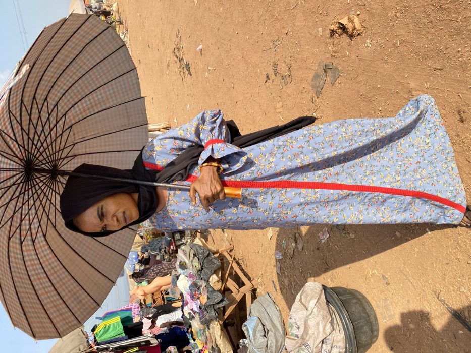 An adult female stands in an outdoor market setting in Adonkolo, Nigeria, under bright daylight
