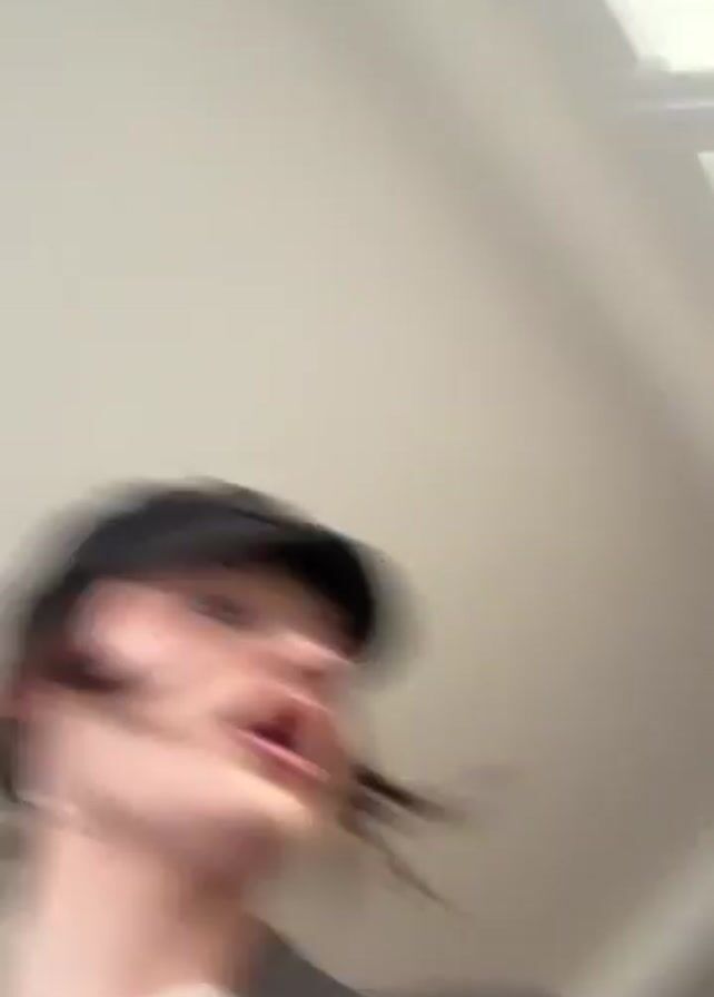 A person wearing a black cap, silver hoop earrings, a dark coat, and dark lipstick is walking towards the camera. They say "Off we go" and "Bye." The scene is indoors with light walls and a window. The camera is handheld and shaky.