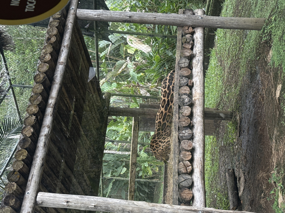 - "The image displays a large feline, identified as a jaguar or ocelot, resting on a raised wooden platform within an enclosure" by FM-rSR2K3, licensed under CC BY 4.0
