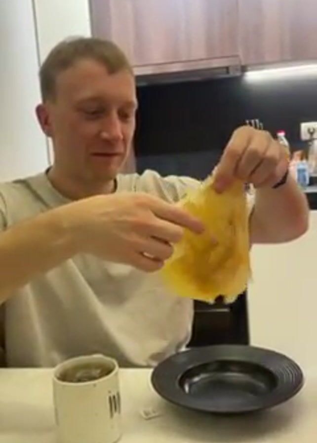 Two individuals are at a table in a kitchen, examining and discussing what appears to be a stack of thin pancakes or crepes. The man, in a light grey t-shirt, holds up a crepe, stretching it between his hands. He is looking at it closely. A woman in a red hooded jacket is seated to his right, also examining a crepe. She is placing it on a black plate, and there is a stack of similar crepes on a larger black plate in front of her. A mug and a jar of orange liquid, possibly jam or honey, are also on the table. The kitchen has wooden cabinets and appears well-lit.
