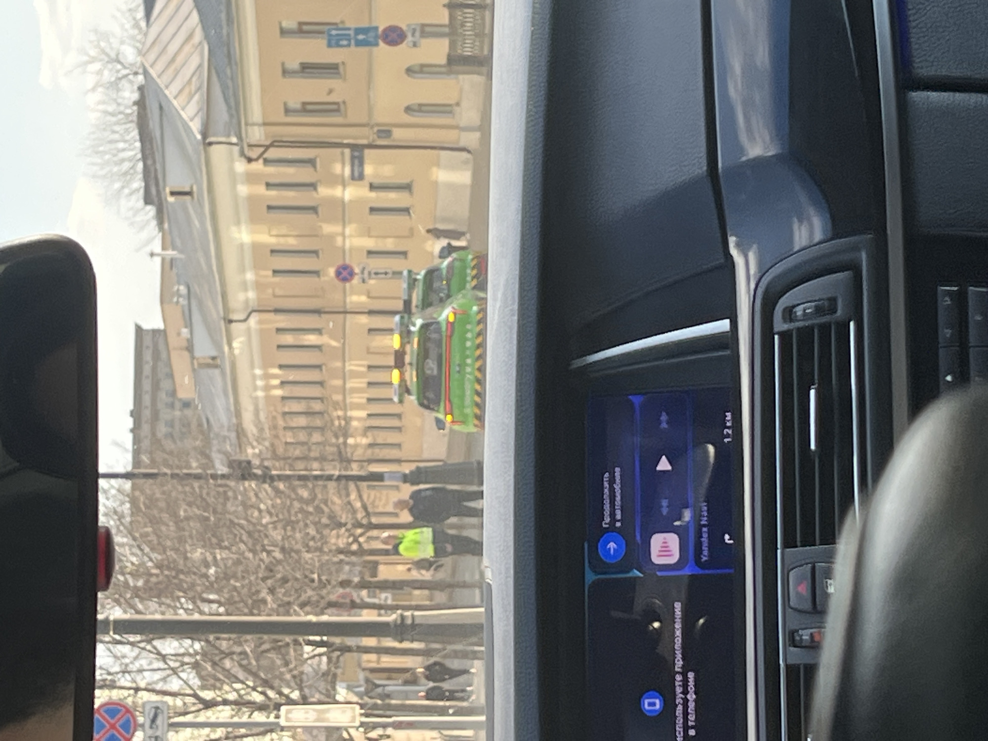 The image depicts a street scene in Moscow, Russia, viewed from the interior of a vehicle, likely a BMW, during daylight hours on an overcast day. In the foreground, the dashboard of the vehicle is visible, featuring a dark grey textured surface. A central infotainment screen displays a navigation interface, identified by the "Yandex Navi" label, indicating a route of "1.2 km." Russian text on the screen reads "Продолжить в автомобиле" (Continue in car) and mentions "используете приложение в телефоне" (using app on phone). Below the screen, air vents and buttons, including a red hazard light button, are discernible. The steering wheel is partially visible on the left. The midground reveals a city street with several individuals and vehicles. On the right side of the road, two identically liveried green vehicles with yellow and red diagonal reflective stripes and amber flashing lights on their roofs are parked, facing away from the viewer. These are identifiable as Moscow's parking enforcement or road service vehicles (GKU AMPP). On the left sidewalk, two men are standing; one is wearing a bright yellow high-visibility jacket, while the other is in dark attire. Further back on the sidewalk, additional pedestrians are walking. The street is lined with bare deciduous trees and dark streetlights. Various traffic signs are present, including a red-and-blue "No Stopping" sign and a blue directional sign with a white arrow. The background features a row of multi-story, light yellow/cream-colored buildings with numerous rectangular windows and grey roofs, characteristic of historical architecture in Moscow. The sky above is light with some cloud cover.