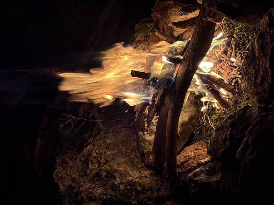 A campfire blazes in the dark, nestled among rocks and thin trees. The flames, predominantly orange and yellow, flicker intensely, creating a blurry effect, suggesting rapid movement. Wood and dried vegetation fuel the fire, positioned within a natural enclosure of dark, weathered rocks. The dark ambiance accentuates the fire's glow, casting shadows across the surrounding terrain.