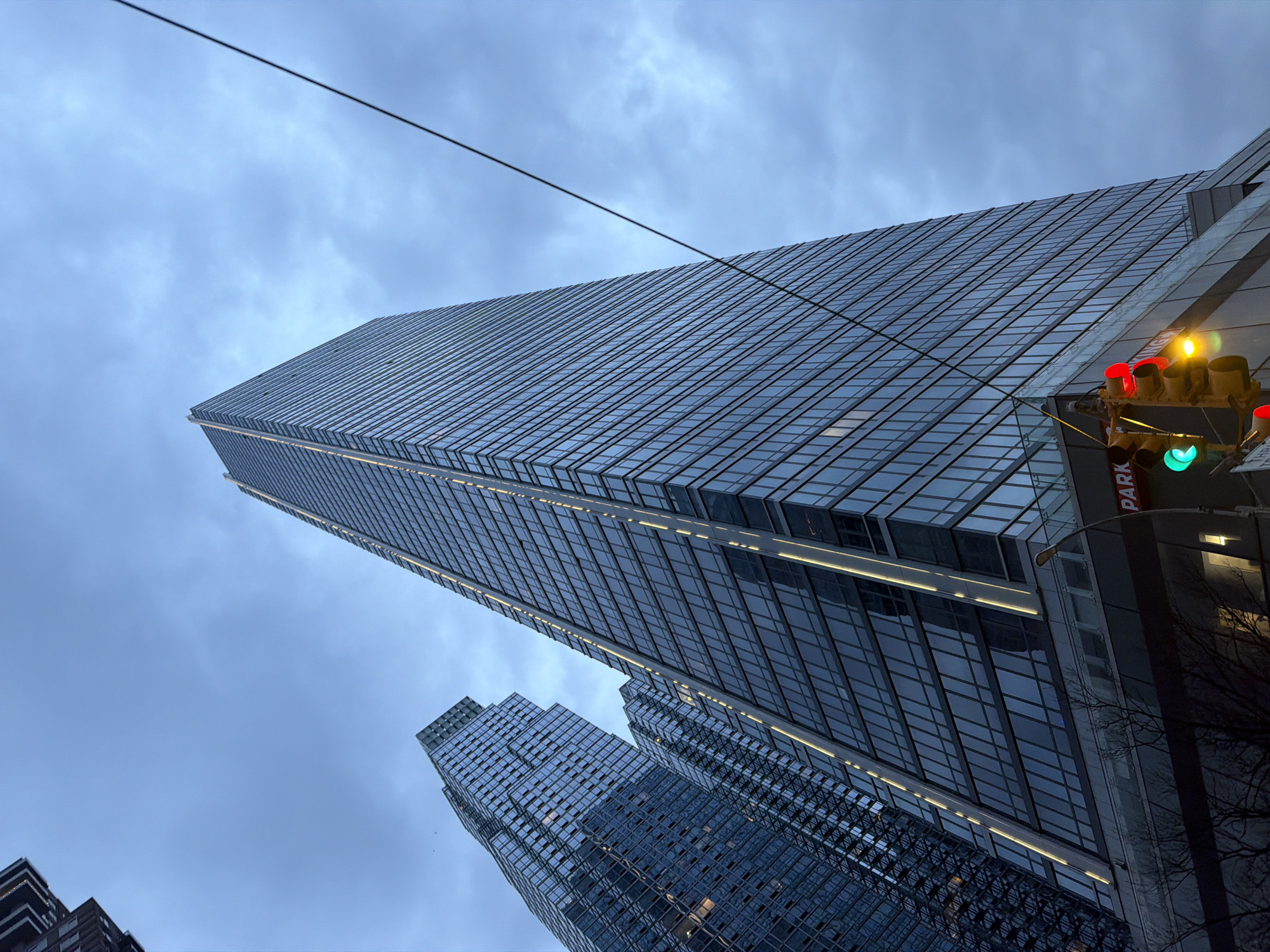 - "A low-angle urban street photograph captures three modern glass-clad skyscrapers against an overcast light blue-grey sky in the Financial District of New York City, United States of America" by FM-punGi2, licensed under CC BY 4.0