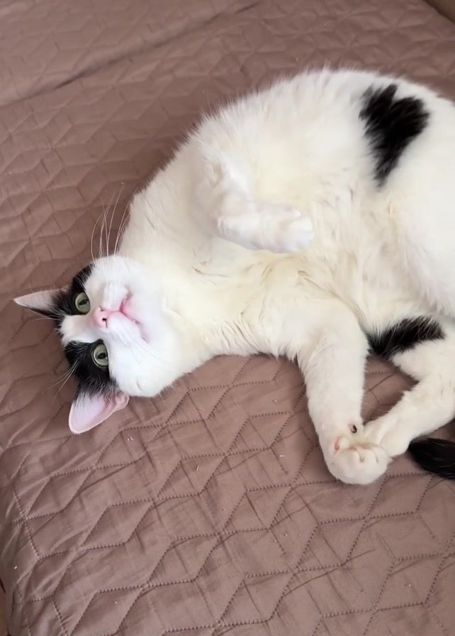 A medium shot shows a white cat with black markings lying on its back on a bed with a tan textured quilt