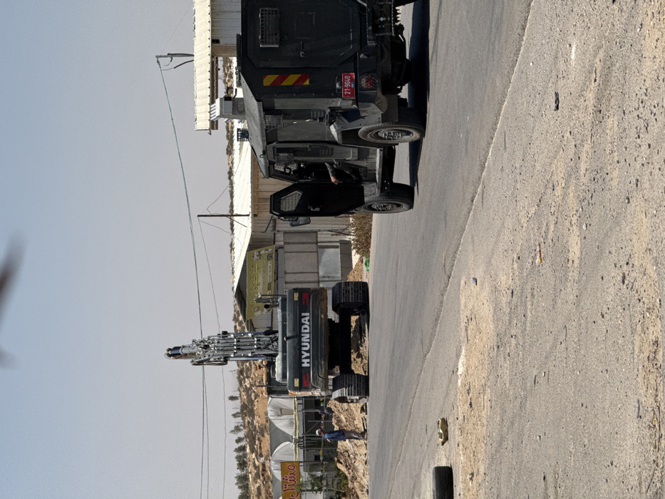 A dark armored vehicle with an open door and a license plate is parked on a road. Behind it, a Hyundai construction excavator is positioned, possibly for roadwork. The setting appears to be a commercial or semi-urban area, with a building alongside the road visible with advertisements. The sky is a clear, light blue.