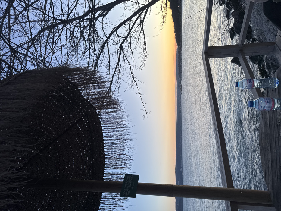 The image depicts an outdoor waterfront scene at either sunrise or sunset, viewed from an elevated wooden deck or balcony in the city of Varna, Bulgaria. In the foreground, a large, dark-thatched umbrella with hanging fringes occupies the upper left quadrant, supported by a wooden pole. Attached to this pole is a small, rectangular green sign with white text in Bulgarian, which translates to "Bringing in food, drinks, and selfies is not allowed." On the right side, a bare-branched tree with extensive dark silhouettes against the sky extends from the bottom-right corner upwards. A wooden railing, forming a perimeter for the deck, runs horizontally across the lower mid-section of the image. On the wooden deck surface, two clear plastic bottles of water, one taller and fuller (labeled "DEVIN"), and another shorter one, are present. The midground features an expansive body of water, likely the Black Sea or Varna Bay, exhibiting slight ripples on its surface and reflecting the subtle colors of the sky. A rocky shoreline is visible directly below the wooden railing. The background shows a distant landmass across the water, with hints of structures or urban development. The sky above the horizon displays a gradient of light orange and yellow, transitioning upwards into a clear light blue, indicative of twilight. No people or explicit actions are visible within the frame.