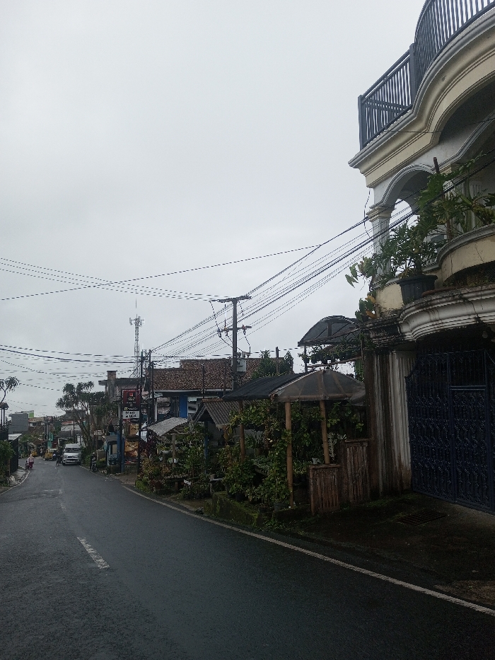 This image depicts a street scene in the city of Babaliya Mal., India, under an uniformly overcast, light gray sky. The asphalt road, appearing wet or damp, recedes into the background, curving slightly towards the left. A faded white line marks the left edge of the road. On the immediate right, a multi-story building featuring cream-colored walls, elaborate white architectural moldings, arches, and a prominent upper-level balcony with a dark railing is visible. A dark blue, ornate metal gate is partially visible at the building's base. Adjacent to the road in front of this building, a small, rustic wooden structure with a dark, possibly conical, roof is present, surrounded by potted plants and general greenery, suggesting a small stall or garden feature. Numerous overhead electrical wires crisscross the upper and mid-sections of the image, emanating from utility poles or the building itself. Along the left side of the road, a dense line of buildings, varying in size and style, extends into the distance, interspersed with trees and bushes. Several utility poles support a complex network of these wires. A tall, lattice-style cell tower stands prominently in the mid-distance on the left. Further down the road on the left, a white van or utility vehicle is visible, and a few indistinct human figures are present on the roadside. No specific actions or interactions between people are discernible.