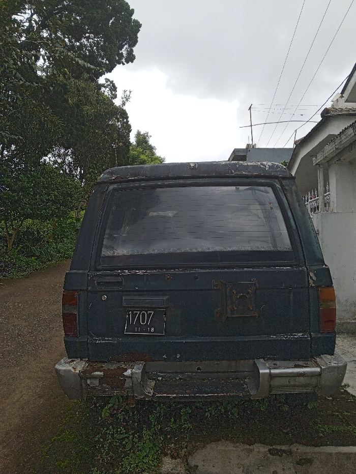 A weathered, dark-colored SUV sits outdoors. Rust is visible on the rear bumper and surrounding metal. The license plate reads "1707 11-18". Behind the vehicle are trees and part of a house. The sky is overcast. Weeds grow beneath the car.