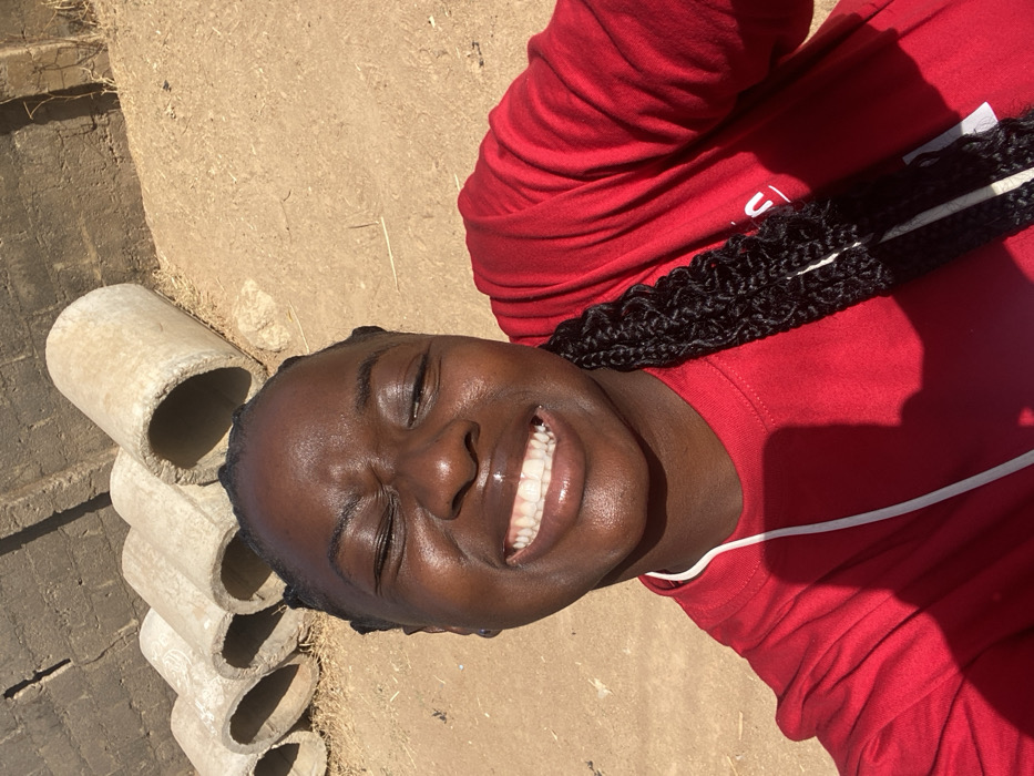 An individual is captured in a close-up, outdoor selfie in Sabon Tasha, Nigeria. The subject, appearing to be female with dark skin and braided hair, occupies the majority of the frame. Her face displays a wide, open-mouthed smile, revealing a full set of white teeth, and her eyes are squinted. She wears a plain red t-shirt, and a white cord, likely an earphone cable, is visible draped on her chest. The background, in softer focus, consists of dry, light brown, sandy ground. To the upper left, a row of several light-colored concrete pipes or culverts are horizontally stacked. Behind the pipes, a textured, reddish-brown concrete or brick wall is present. The scene is brightly lit by direct sunlight, casting noticeable shadows.