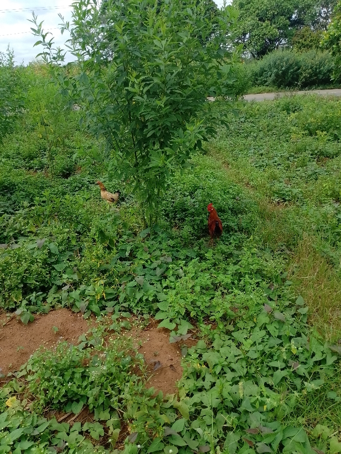 The scene is an outdoor, vegetated area in Ugwolawo, Nigeria, under an overcast sky. Two domestic fowl are present among lush green foliage. A reddish-brown rooster stands on the right, facing away from the viewer, partially obscured by green ground cover. To the left and further back, a tan and brown hen is visible, also amidst dense green plants. A prominent leafy green tree stands centrally, with other shrubs and trees in the background. Patches of reddish-brown earth are visible in the foreground. A paved road curves across the upper right portion of the background, partially hidden by vegetation.