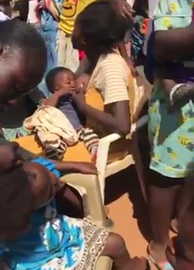 The scene appears to be outdoors, possibly in a rural or community setting, with a crowd of predominantly Black women and children
