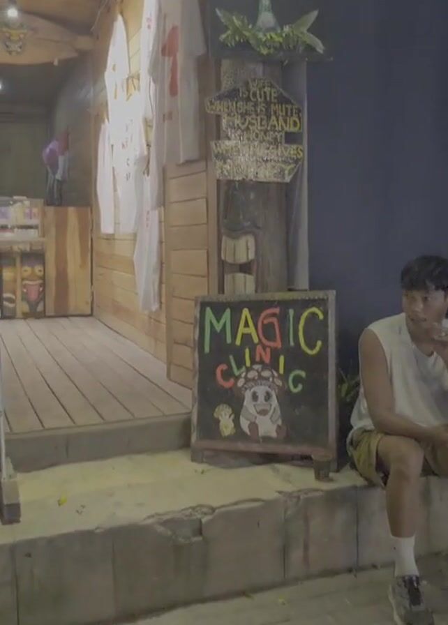 street scene in front of a small shop with wooden facade. A young man is sitting on a step next to a sign that reads "MAGIC CLINIC" with a drawing of a cartoon mushroom. To the side of the shop, there's a sign advertising "IGET Disposable Pod Device BAR" at 3500 puffs, 5% nicotine. A man in an orange shirt holding a packet of what seems like the advertised products is seen standing in front of the sign, gesturing with his hands. The overall environment suggests a touristy or hip area, likely at night.