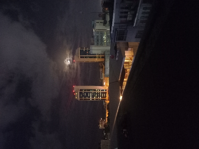 At night, two tall buildings illuminated with many lights stand against a dark sky with scattered clouds. The moon is partially obscured, appearing as a faint, bright spot among the clouds. The image is rotated, with the buildings appearing to stand vertically despite the landscape orientation. A dark, blurred foreground element obscures part of the right side. Distant city lights are visible in the lower part of the frame.