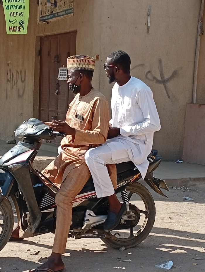 Two men are sitting on a parked black motorcycle. The driver wears a tan shirt, patterned pants, a traditional cap, sandals, and a black face mask. The passenger has on a white shirt and pants with black shoes. They both appear to be looking ahead. Behind them is a building with faded writing on the wall and a sign about money transfers. The motorcycle's model is LF110.