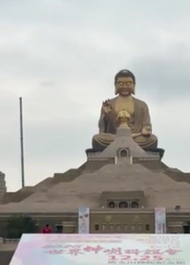 large Buddha statue sitting on top of a tan colored pyramid-like structure