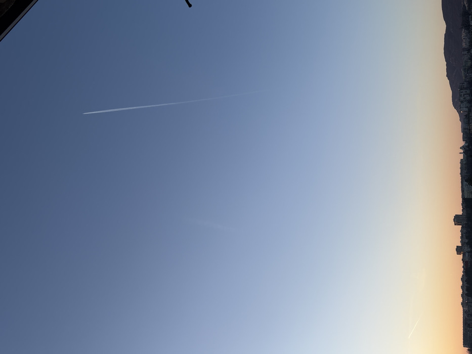 The image displays an expansive view over the city of Gabrovo, Bulgaria, likely captured from an elevated position. The sky dominates the upper two-thirds of the frame, presenting a clear gradient from a light blue at the top to a subtle orange-yellow hue at the horizon, indicative of either sunrise or sunset. A distinct, linear white contrail extends vertically from the top edge of the frame, slightly right of center. A second, fainter, horizontal white contrail is visible in the lower-left portion of the sky. The lower third of the image reveals the city's horizon, characterized by a dense collection of urban buildings, including multi-story structures, forming a silhouette against the colorful sky. To the far right, a dark, undulating mountainous or hilly terrain is visible beyond the cityscape. A dark, angular structural element is partially observable in the extreme upper-right corner, suggesting the presence of an architectural feature like a balcony railing or roof overhang. No individuals or discernible actions are present within the scene.