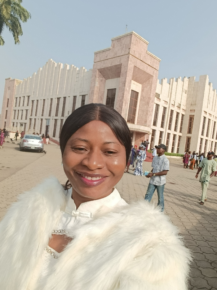 - "A smiling woman in a white fur shawl takes a selfie in front of a large building with a unique, fortress-like design" by FM-9W5842, licensed under CC BY 4.0