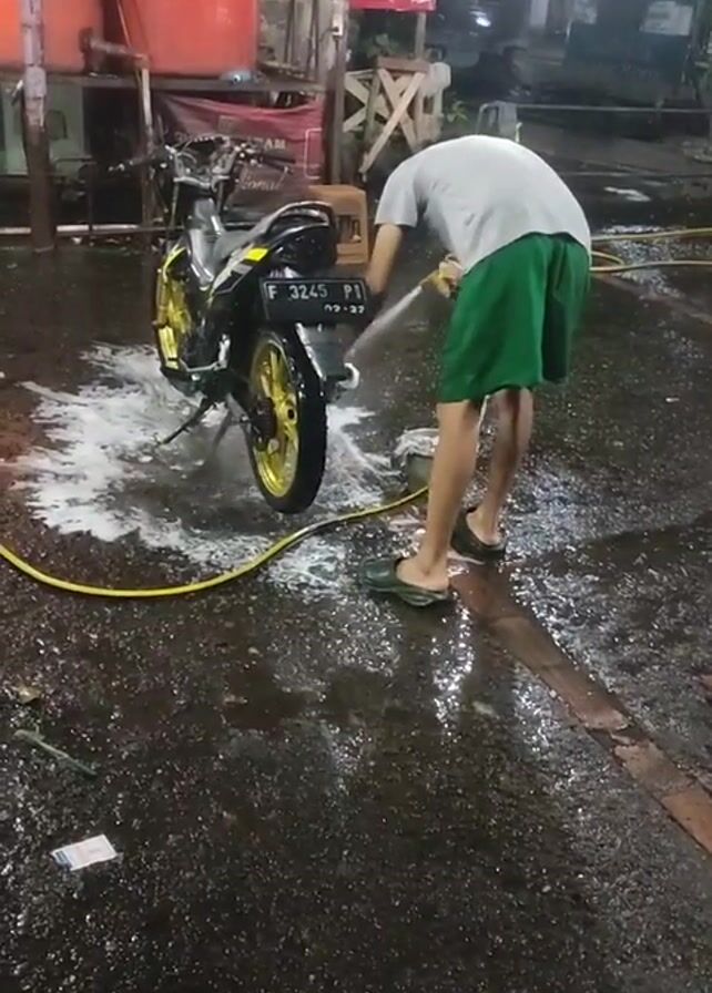 A person is washing a motorcycle outside at night. The person is wearing a light-colored t-shirt, green shorts, and sandals. The motorcycle is black with yellow rims and its license plate number is F 3245 PI. The person is using a hose to spray down the motorcycle, which is surrounded by soapy water on a wet, paved surface. Two large orange water tanks are visible in the background, along with other objects partially obscured by the dim lighting.