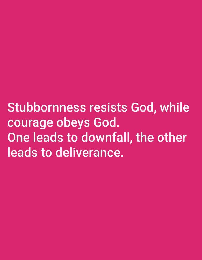 The image displays a digital graphic featuring white sans-serif text against a solid fuchsia background, situated in the city of Unknown, Unknown. The text reads: "Stubbornness resists God, while courage obeys God. One leads to downfall, the other leads to deliverance." No human subjects, animals, or physical objects are visible. No actions or interactions are depicted within this digital environment.
