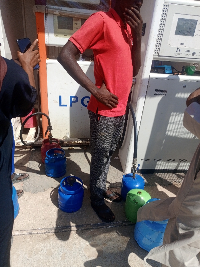 This image depicts an outdoor scene at an LPG dispensing station in Dutsinma B, Nigeria, under daylight conditions