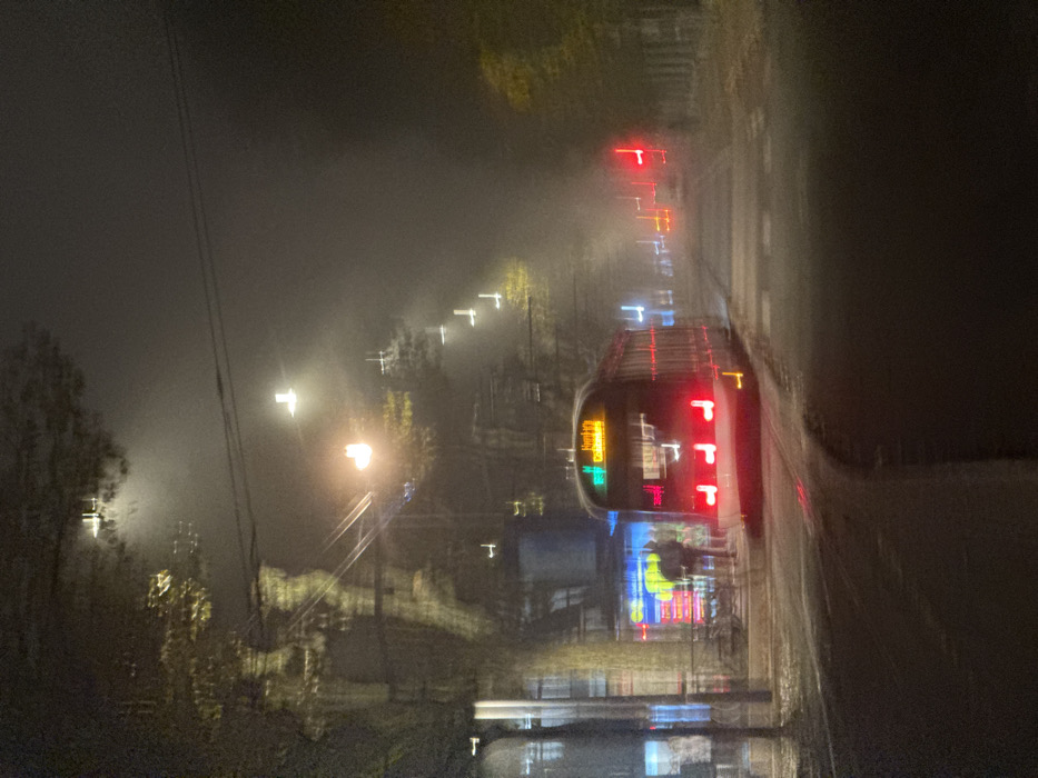 A blurry, low-light photograph shows a train or tram at night. The vehicle features various lights, including red tail lights and illuminated displays. Streetlights line the road, obscured by fog. Trees are visible on the left side of the frame. The overall scene is dark and indistinct, with motion blur evident.