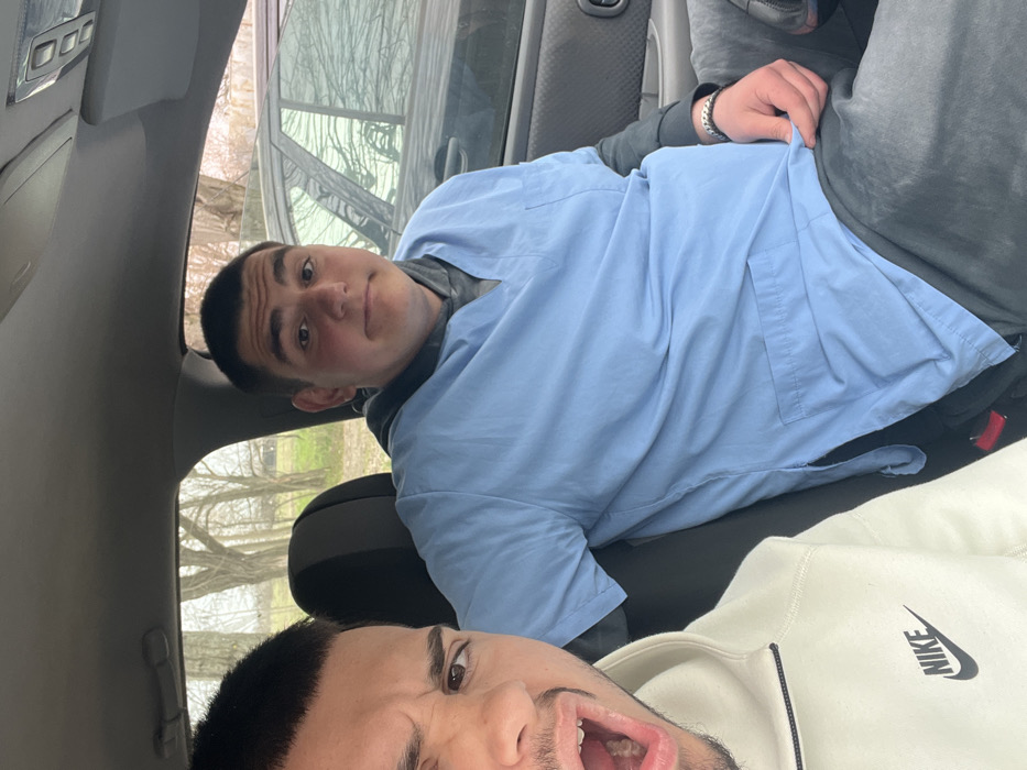 The image depicts two males inside a vehicle, located in Stara Zagora, Bulgaria. The individual on the left, partially visible and in the foreground, has short dark hair and a beard, wearing a light-colored hoodie with a black "NIKE" logo. This individual's mouth is open wide, and eyes are focused towards the camera, suggesting an active pose. The individual on the right, fully visible, has short dark hair and is wearing a light blue V-neck scrub top over a dark grey long-sleeved garment, with dark grey pants. A silver-colored chain-link bracelet is present on his left wrist. He is seated, looking towards the camera with a neutral expression. His left hand rests on his lap. The vehicle interior shows dark-colored upholstery and trim. Through the windows, a natural outdoor environment is visible, characterized by bare trees with thin branches, indicative of a dormant season. Patches of green vegetation are present on the ground. A dark-colored parked vehicle is partially visible in the background, reflecting the surrounding trees. The lighting suggests daytime conditions.