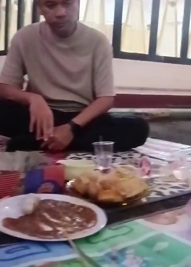 A video shows two people sitting on a patterned mat on a floor, eating food and drinking