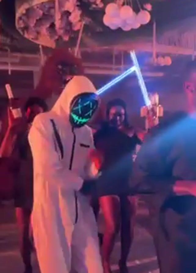 group of people dancing at what appears to be a party or club. The lighting is low and colorful, with pinks, blues and purples dominating. Overhead, there's a decorative installation resembling a flowering canopy with hanging white balloons. The main focus of the video is on a person wearing a white jumpsuit with black trim and a hood. The person is also wearing a green glowing mask that obscures their face, featuring an "X" over the eyes. They are dancing and facing the camera. To the right, a woman in a short black dress and heels is dancing and holding two glowing light sticks, one in each hand. Behind the masked person, there's a large, furry, brown gorilla statue. There are other people in the background, and some are holding what seem to be bottles of alcohol. The atmosphere is energetic and celebratory.