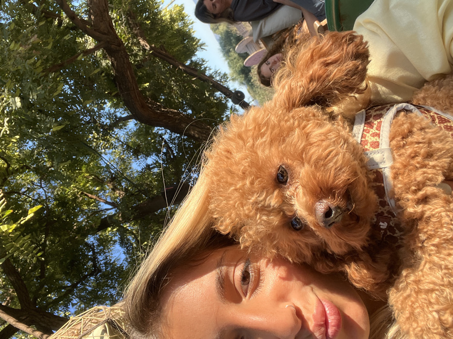 An outdoor scene in Kfar Ruth, Israel, depicts a close-up selfie focusing on a young adult female and a dog under bright sunlight. The female, visible from the left side of the frame, has long blonde hair, a nose ring, and is making a "kissing" face. She is holding a small, medium-brown, curly-haired dog, resembling a Poodle, which occupies the central and right foreground. The dog has dark eyes, a black nose, and wears a patterned harness. In the blurred background, under a canopy of green trees and a clear blue sky, two other females are seated. One, further back, has long dark hair and wears a dark top. The other, closer to the foreground, has curly dark hair and wears a patterned top, with light-colored, possibly decorative, elements visible behind her head. A wicker-like structure is partially visible on the far left.