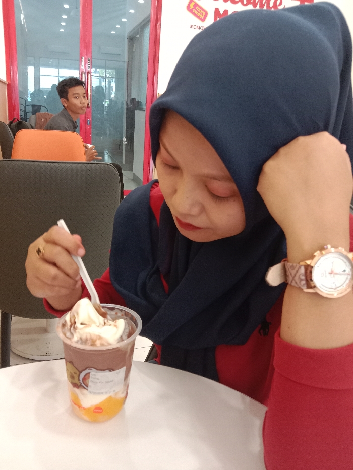 The image portrays an indoor scene within an eatery located in Kaliwungu, Indonesia. In the foreground, a woman wearing a dark blue hijab and a red long-sleeved top is seated at a white table, looking downward. Her right hand, with a ring on the ring finger, holds a white plastic spoon, which is partially submerged in a multi-layered dessert contained within a clear plastic cup. The dessert features a yellow/orange bottom layer, a white layer, a brown layer, and a scoop of white ice cream with chocolate drizzle on top; a "MOMOYO" brand label is visible on the cup. Her left forearm rests on the table, displaying a rose-gold colored wristwatch with a patterned light-colored strap. In the background, to the left, a young man in a dark-colored shirt is seated, looking towards the camera. The environment includes red structural elements, possibly door frames or columns, a white wall with red text and a "more sweet" graphic, and reflective glass panels. Dark grey and orange-backed chairs are also visible in the background.