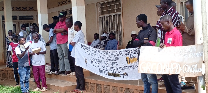 An outdoor public gathering is depicted in Kundu 1, Democratic Republic of the Congo, taking place in front of a light-colored, single-story building featuring pillars, a veranda, concrete steps, and barred windows. Approximately 20-30 individuals, predominantly adult males, are present. In the foreground, a man in a grey vest over a red t-shirt and blue jeans holds a white megaphone in his left hand, appearing to address the group. Beside him, another man in a light grey t-shirt and maroon trousers holds a small, light-colored rectangular object. Two banners are prominently displayed. A white fabric banner, held horizontally by at least two individuals, contains black text partially reading: "AMANI NA KUPIGANISHA GRADE ASBL UTENDO VYA UJEHURI WAKATI WA VITA RDC SUDKIVU TERRITOIRE DE FIZI LE." This banner also features a stylized figure on the left and a rifle on the right. To the right, a vertical, light-colored sign is held by a man in a red polo shirt, displaying text including "...DES DROITS ET LE DEVELOPPEMENT GROOHPD-CONGO ASBL." A larger group of individuals stands on the concrete steps and veranda behind the banner holders. Notable among them is a man in a red button-down shirt and a dark green baseball cap, standing with his arms crossed. Other individuals are seen standing, observing, or seated further back on the veranda. The scene suggests a public assembly or demonstration, likely focused on human rights and development issues, indicated by the banner texts and the use of a megaphone.