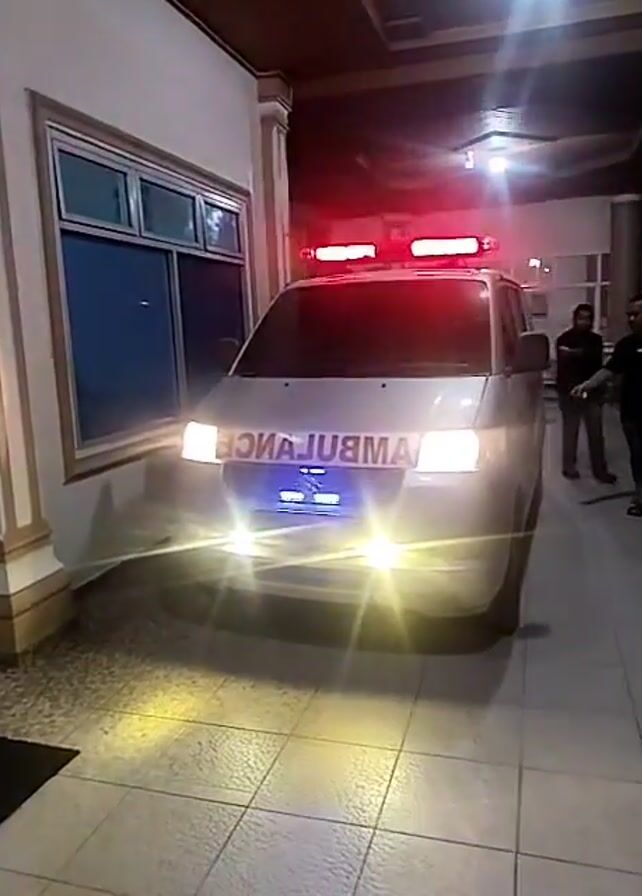 A static shot reveals a silver ambulance parked at the entrance of a building, presumably a medical facility, with its headlights and emergency lights activated. The vehicle, identified by the word "AMBULANCE" written in reverse across its hood, is a Suzuki. The building has a tiled floor and decorative pillars, with a window visible to the left of the ambulance. Two individuals stand to the right of the vehicle. One person appears to be walking further away, while the other stands closer to the frame, looking on. The overall lighting suggests it is nighttime or an indoor setting with artificial illumination.