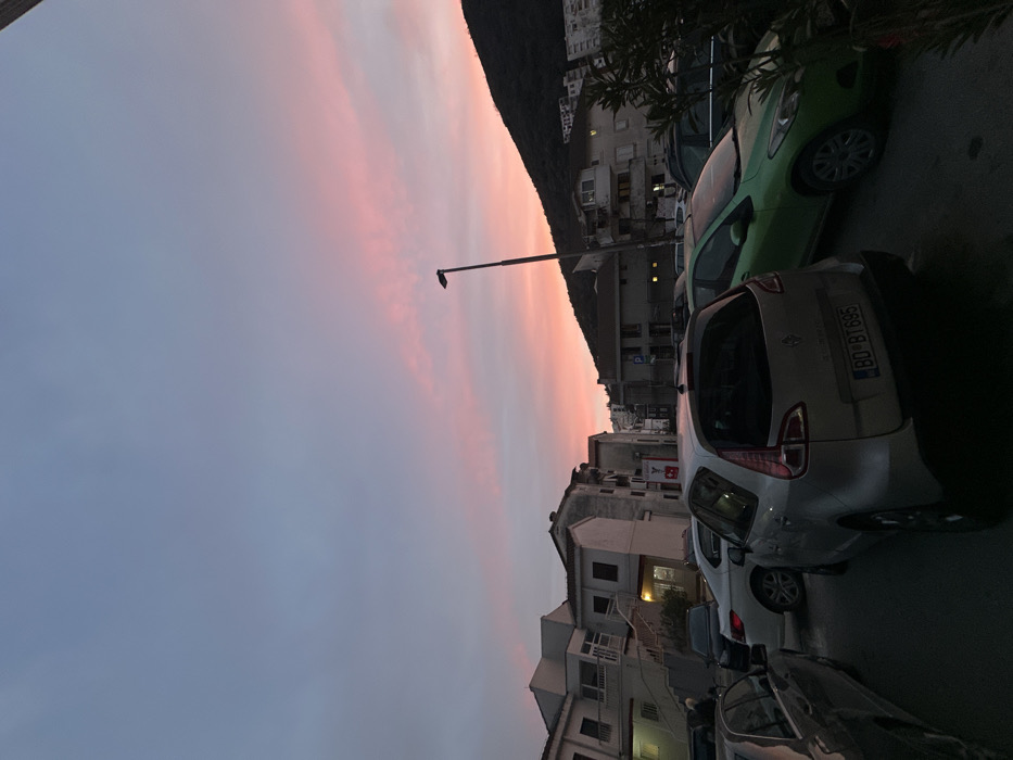 The image captures an urban street scene in Budva, Montenegro, at sunset or dusk