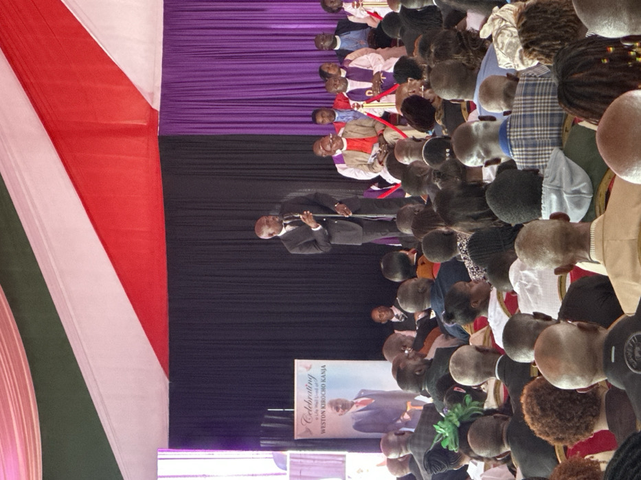 The image depicts an indoor gathering in the city of Unknown, Kenya, under a ceiling draped with green, white, and red fabrics. A stage at the front features a backdrop of black curtains on the left and purple curtains on the right. A dark-skinned male, dressed in a dark suit, white shirt, and dark tie, stands center stage, speaking into a microphone on a stand. To his left, a vertical banner reads "Celebrating a Life Well Lived of WESTON KIROCHO KANJA" and displays a portrait of an older man in a suit. To his right, several individuals are seated, many in religious vestments including robes and stoles. Numerous attendees are visible from behind, seated in rows, facing the stage.