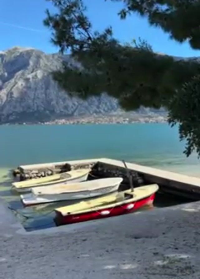 tranquil scene with several small boats docked near a concrete pier along a shoreline. Four boats are visible, including one painted red and white. The water is clear and calm, reflecting the sky. In the background, a large mountain range stretches across the horizon beneath a clear blue sky with a few wispy clouds. A tree branch with green foliage partially obscures the view in the foreground, adding depth to the scene. The ground consists of a mix of sand and small stones. The lighting is bright and natural, suggesting a sunny day.