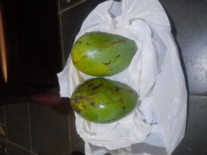 The image depicts an indoor scene, identified as being in Kecamatan Pati, Indonesia, based on provided information. Two green, oblong fruits, consistent with mangoes, are positioned centrally within a crumpled white plastic bag. The fruit on the left exhibits a darker green skin with numerous dark blemishes and streaks. The fruit on the right displays a lighter green hue with fewer and less prominent dark markings. Both fruits appear whole and intact. The white plastic bag, folded and creased, rests on a dark tiled floor, visible in the lower portion of the frame with faint grout lines. In the upper background, a dark wooden furniture leg and a lighter, horizontally oriented wooden element are partially visible, suggesting an item of furniture. Illumination appears to be from an overhead source, reflecting off the fruit surfaces. No individuals, actions, or direct interactions are present.